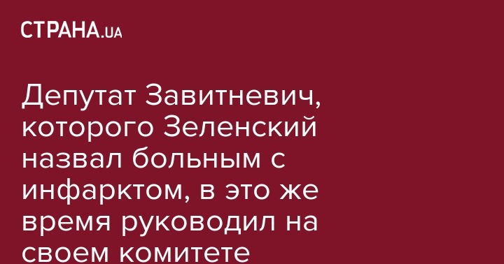 Глава комитета Верховной Рады Украины по вопросам национальной безопасности, обороны и разведки Александр Завитневич, который, по словам президента Украины Владимира Зеленского, якобы лежит в больнице с инфарктом, 9 октября давал брифинг перед телекамерами, а сегодня принимал участие в заседании комитета.