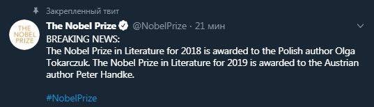 В четверг, 10 октября, был объявлен лауреат Нобелевской премии по литературе в 2019 году. Об этом сообщает пресс-служба Нобелевского комитета в Twitter.