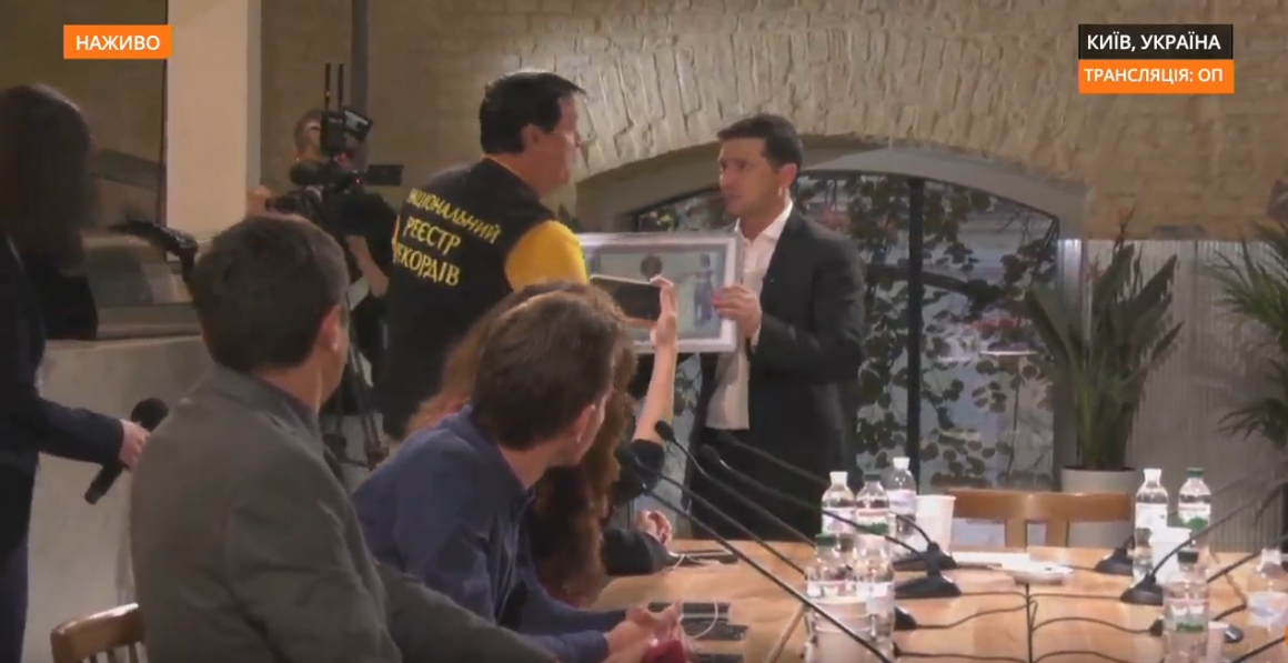 Затем он вручил президенту диплом. На это Зеленский сказал, что он скромный человек и особой радости не показал. Он спросил у Мендель, кто подготовил вручение. На что она ответила, что с ее стороны ничего такого не планировалось и не готовилось.