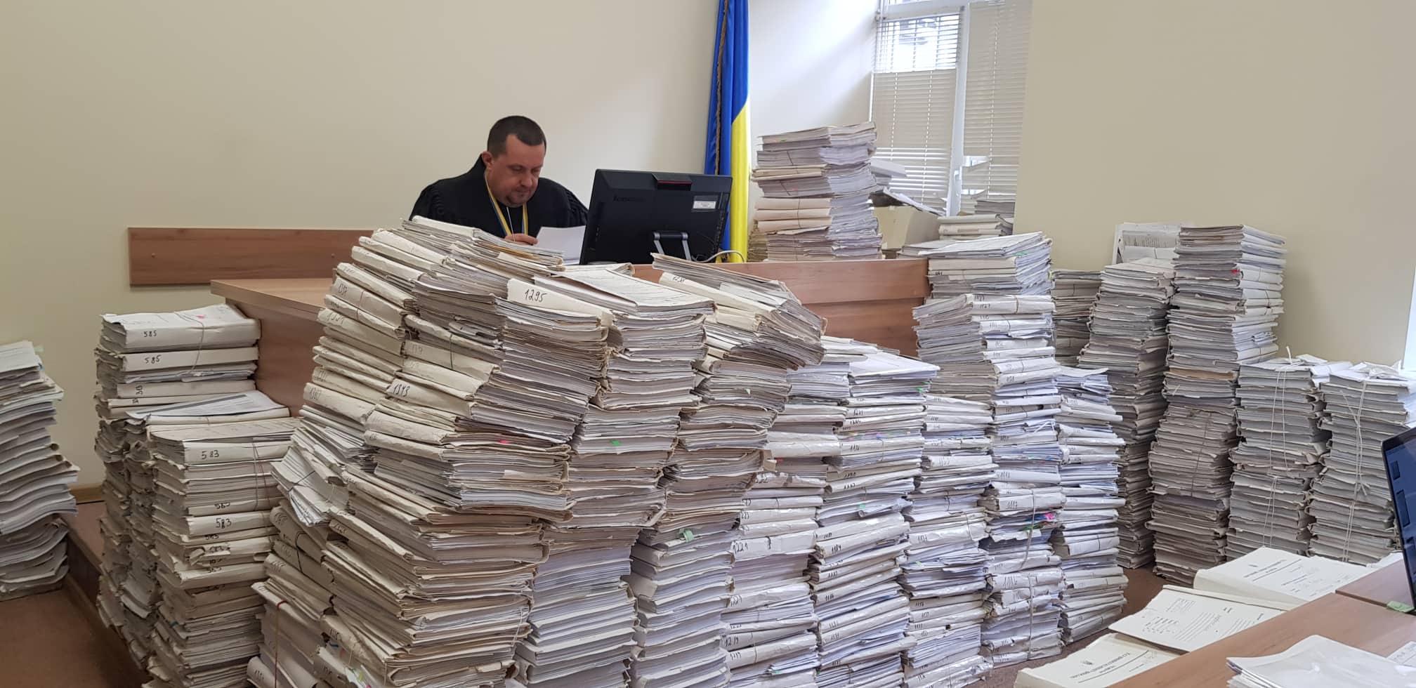 Судья рассматривает дело о восстановлении Шевчука в должности главы Конституционного суда под грудой бумаг. Фото