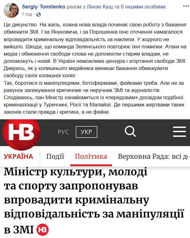 Да, бороться с манипуляциями, ботофермами и фейками надо. Но не за счет запугивания критических или неудобных СМИ и журналистов. Надеюсь, господин министр ознакомится с "передовым" опытом подобной криминализации в Турции, России и Малайзии. Где первыми жертвами таких законов стали правда и критика, а не фейки", - написал Сергей Томиленко.