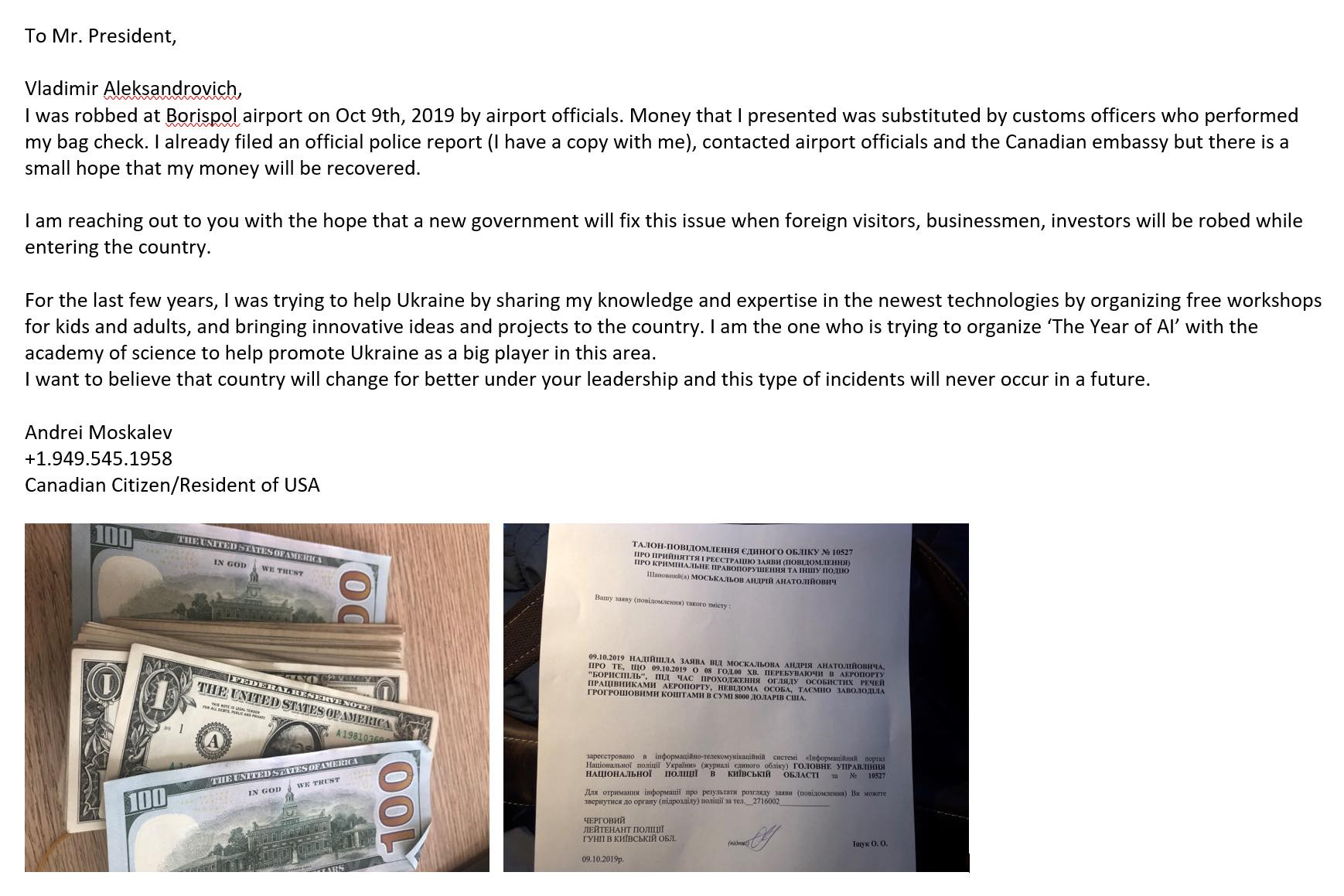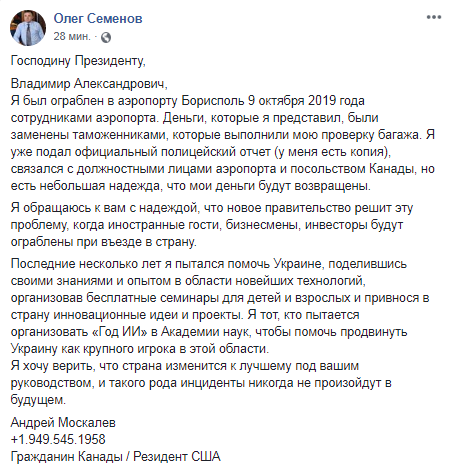 "Я был ограблен в аэропорту Борисполь 9 октября 2019 года сотрудниками аэропорта. Деньги, которые я представил, были заменены таможенниками, которые выполнили мою проверку багажа. Я уже подал официальный полицейский отчет (у меня есть копия), связался с должностными лицами аэропорта и посольством Канады, но есть небольшая надежда, что мои деньги будут возвращены", - написал в нем Москалев.