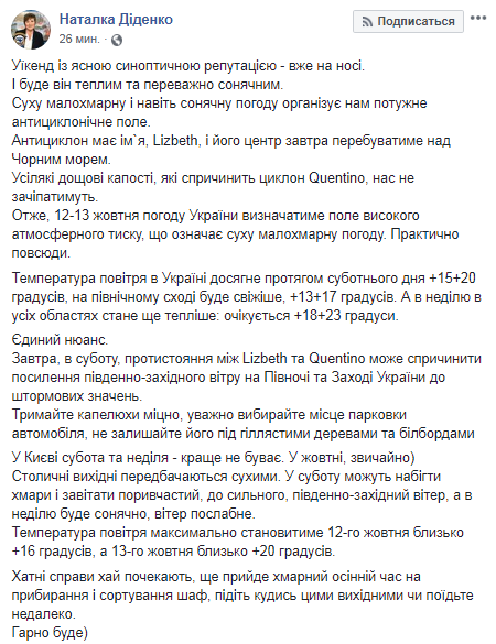 "Уикенд с ясной синоптической репутацией - уже на носу. И будет он теплым и преимущественно солнечным. Сухую малооблачную и даже солнечную погоду организует нам мощное антициклонической поле. Антициклон Lisbeth и его центр завтра будет находиться над Черным морем. Всевозможные дождевые пакости, которые повлечет циклон Quentino, нас не затронет", - написала Диденко.