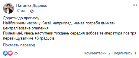 "В ближайшее время в Киеве, например, нет необходимости включать централизованное отопление. По крайней мере, все следующую неделю средняя суточная температура воздуха будет превышать +8 градусов", - добавила синоптик.
