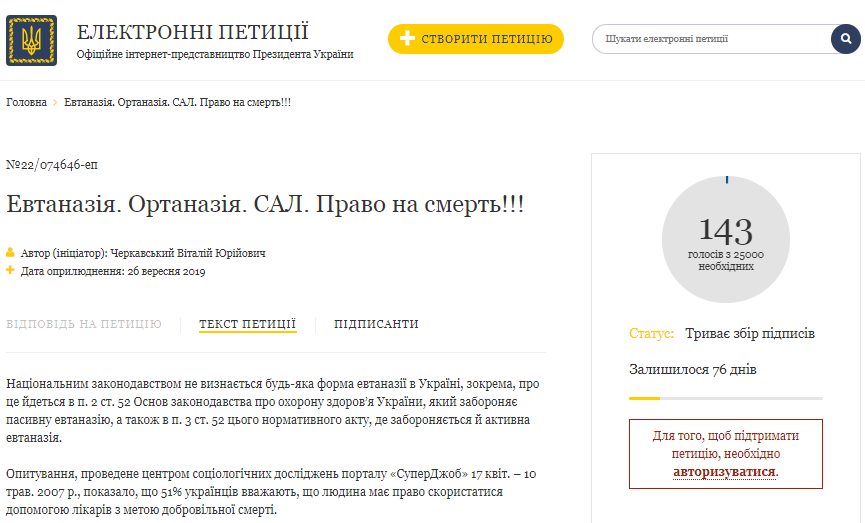 За последние четыре года на сайте президента было зарегистрировано 11 петиций о необходимости закона об эвтаназии, но все они получили мизерное количество голосов: от 26 до 305 при необходимых для рассмотрения 25 тысячах.
