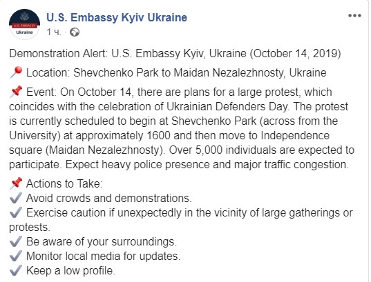 Американское посольство в Украине обратило внимание своих граждан на проведение в Киеве 14 октября, в День защитника Украины, марша националистов, призвав проявлять осторожность и сдержанность.
