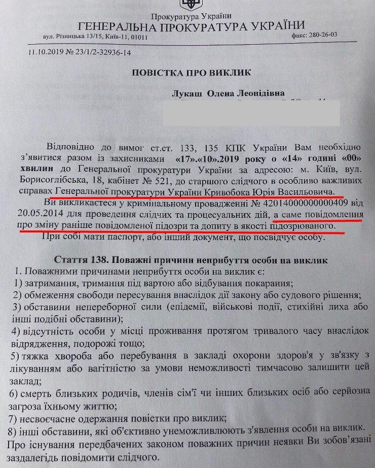 Позже в комментарии журналистам Лукаш сказала, что "пидозру" ей могли подписать только генпрокурор или его заместители - таковы правила объявления подозрений адвокатам. То есть это не могло быть "эксцессом исполнителя", а координировалось напрямую из офиса Рябошапки.