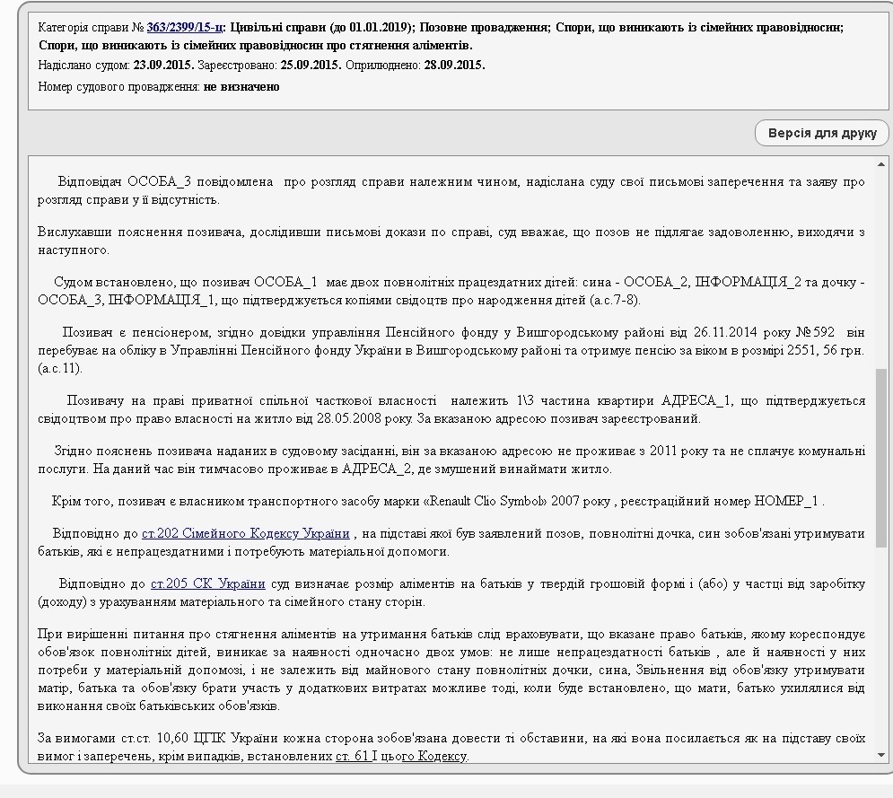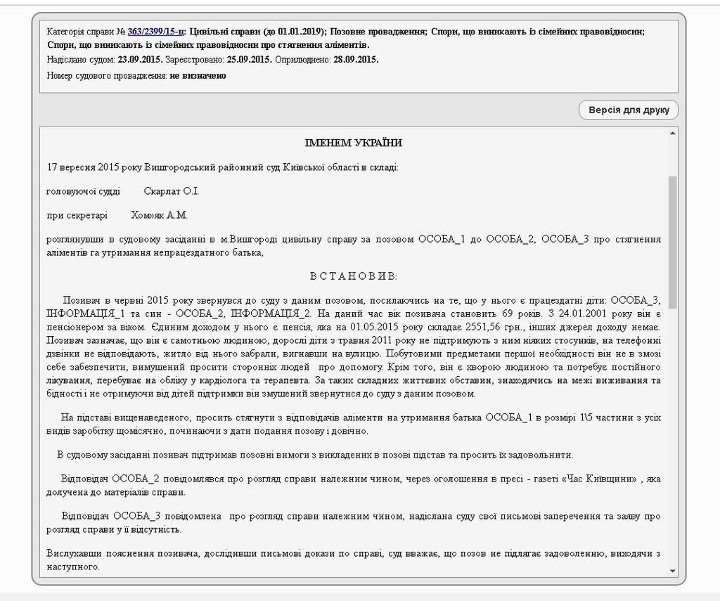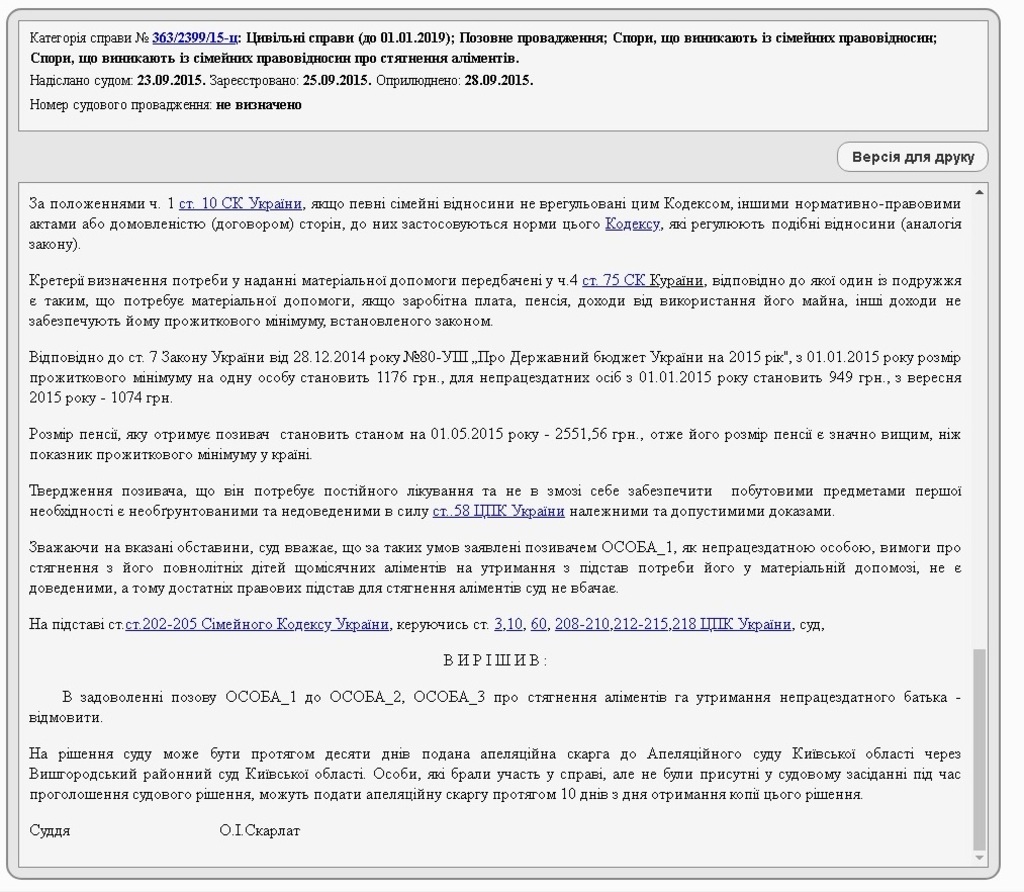Однако судья Елена Скарлат отказала в удовлетворении исковых требований. Основаниями для отказа, как следует из материалов дела, является то, что Георгий Рябошапка получает пенсию по возрасту, которая на тот момент составляла 2551,56 грн и превышала установленный на тот момент законодательством прожиточный минимум (1176 грн), а также на правах совместной собственности отцу, согласно информации суда, принадлежала 1/3 квартиры. Кроме того, он указан как владелец автомобиля.