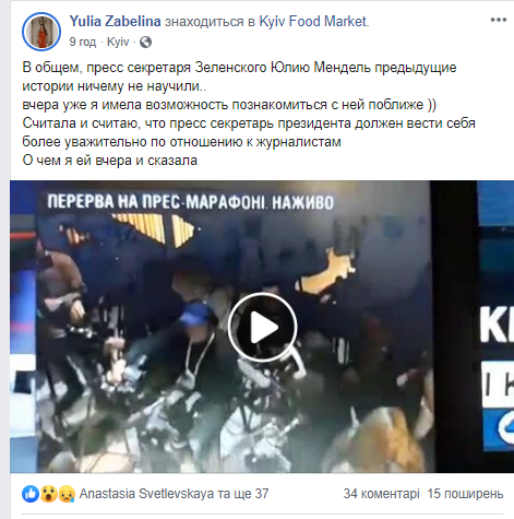 "В общем, пресс-секретаря Зеленского Юлию Мендель предыдущие истории ничему не научили .. Вчера уже я имела возможность познакомиться с ней поближе. Считала и считаю, что пресс-секретарь президента должен вести себя более уважительно по отношению к журналистам. О чем я ей вчера и сказала ", - написала Забелина.