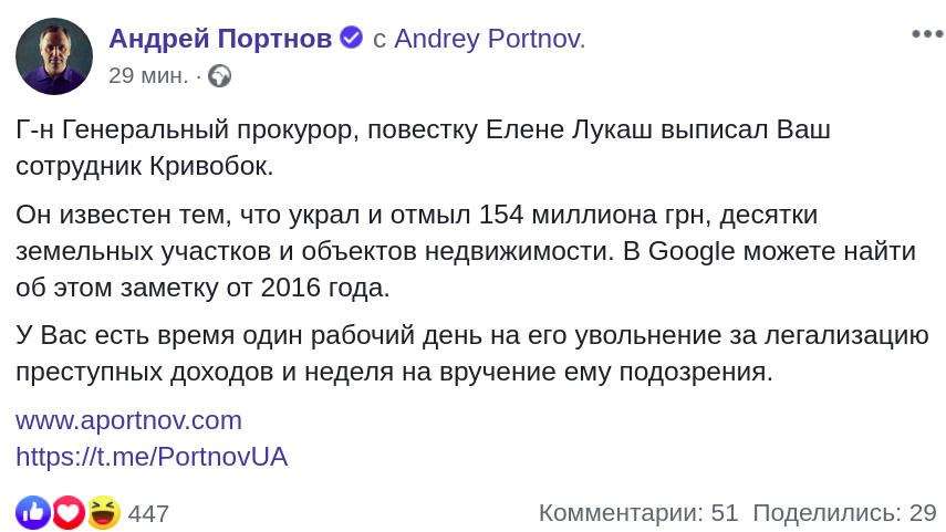 "Г-н Генеральный прокурор, повестку Елене Лукаш выписал Ваш сотрудник Кривобок. Он известен тем, что украл и отмыл 154 миллиона грн, десятки земельных участков и объектов недвижимости. В Google можете найти об этом заметку от 2016 года", - написал правозащитник.