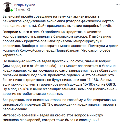 "Зеленский провёл совещание на тему как активизировать банковское кредитование экономики (которое фактически мертво последние лет пять). Сайт президента выложил подробный отчёт.