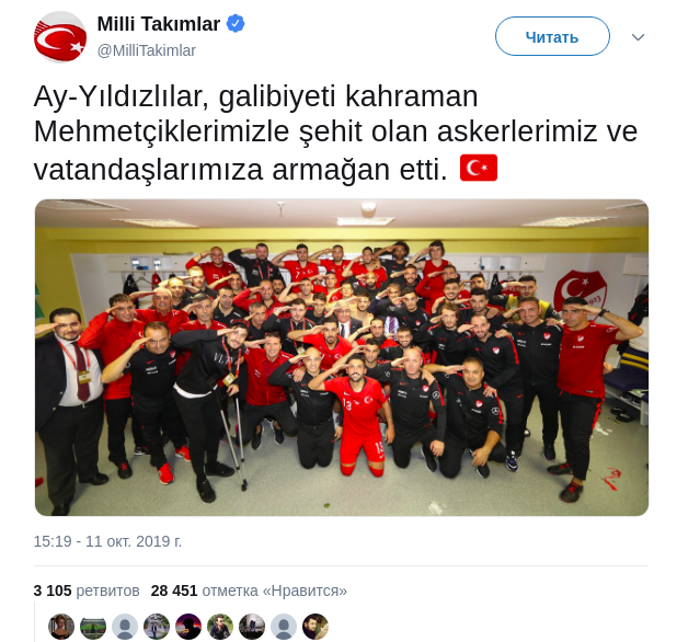 В пятницу, 11 октября, сборная Турции по-военному отпраздновала гол в ворота Албании. Игроки подбежали к трибуне и отдали честь.