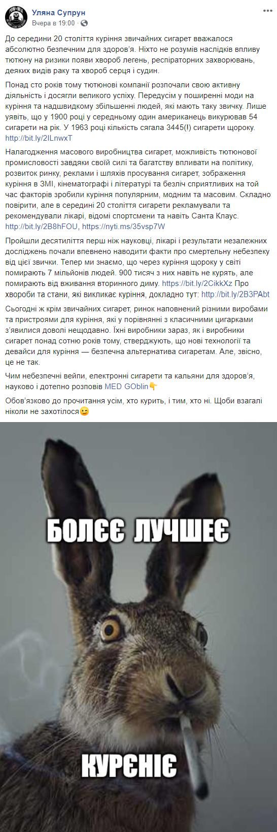 Бывший и.о. министра здравоохранения Уляна Супрун поделилась в Facebook публикацией пользователя MED GOblin о вреде курения и прокомментировала его исторической справкой о сигаретах.