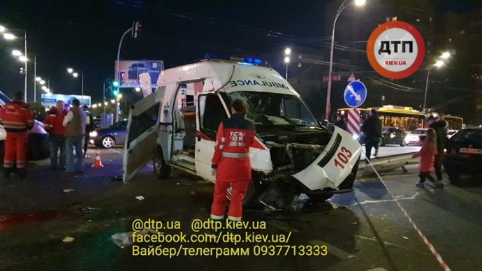 Автомобиль скорой помощи ехал на перекрестке с Маяковского на Перова на красный свет, в автомобиле находился ребенок. В это время девушка с двумя детьми на автомобиле "Peugeot" двигалась по ул. Ватутина в направлении Троещины на зеленый свет. "Скорая" ударила "Peugeot" в левый борт и опрокинулась.
