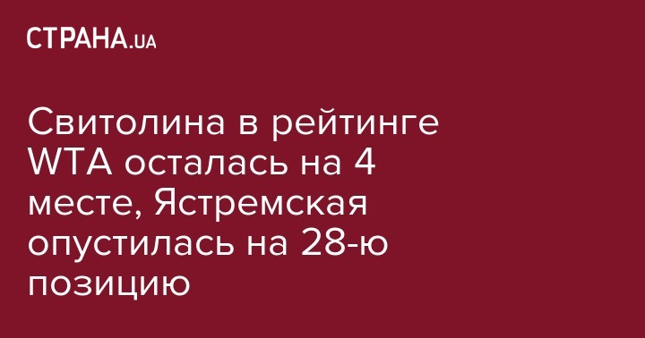 Еще одна украинская теннисистка Даяна Ястремская (1775) опустилась на 5 строчек и занимает 28-е место. Леся Цуренко (842), которая долгое время не выступает из-за травмы, занимает в списке 72-е место. Четвертый представитель Украины в первой сотне мирового рейтинга Екатерина Козлова (746) поднялась на 82-ю строчку (+1).