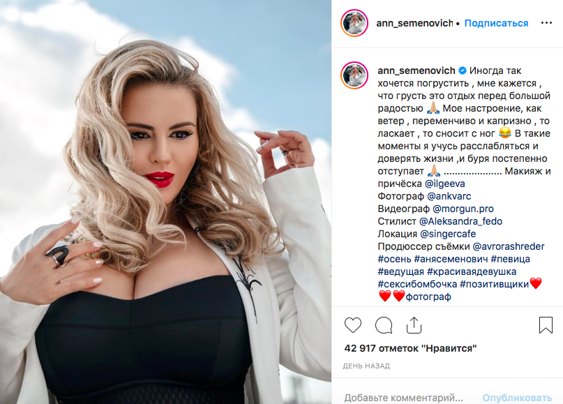 Анна Семенович - активный пользователь Инстаграм. Вчера она опубликовала фото с глубоким декольте и алой помадой, прямо как на татуировке.
