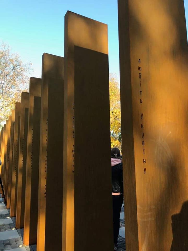Рядом с монументом установлены 14 колонн со строками из стихотворения Владимира Сосюры "Любите Украину". Стелы символизируют год начала войны – 2014-й.