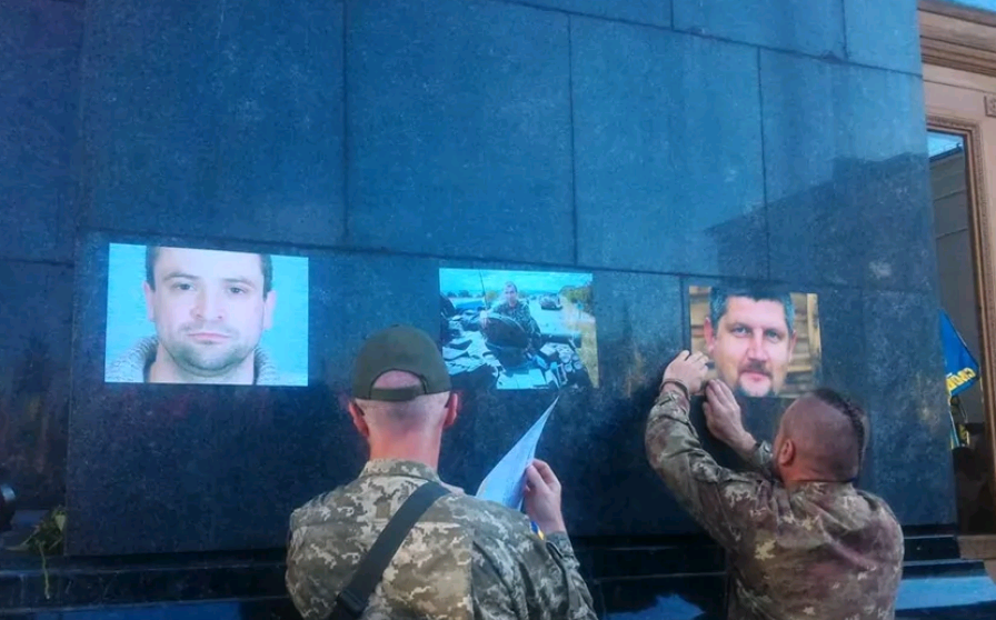 Националисты из "Правого сектора", участвующие в марше в честь 77-летия УПА 14 октября, прикрепили ко входу в Офис президента портреты погибших в АТО военнослужащих. Об этом сообщает агентство "Українські Новини".