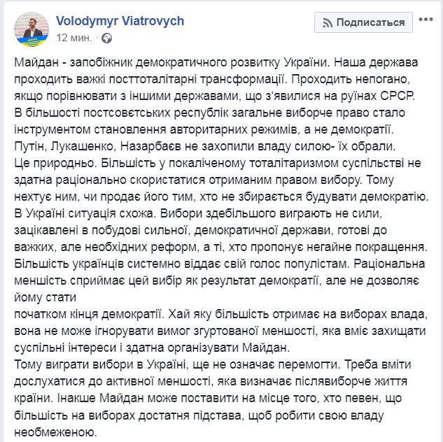 "Поэтому выиграть выборы в Украине еще не значит победить. Надо уметь прислушиваться к активному меньшинству, которое определяет жизнь страны после выборов. Иначе майдан может поставить на место того, кто уверен, что большинство на выборах - достаточное основание, чтобы делать свою власть неограниченной", - пригрозил Вятрович.