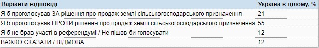 Как сообщается, если бы референдум о продаже земли состоялся в ближайшее воскресенье, то 55% украинцев проголосовали бы против продажи земли, 21% - за продажу, 12% не принимали бы участие в таком референдуме, еще 12% - не определились со своим мнением.
