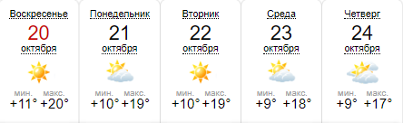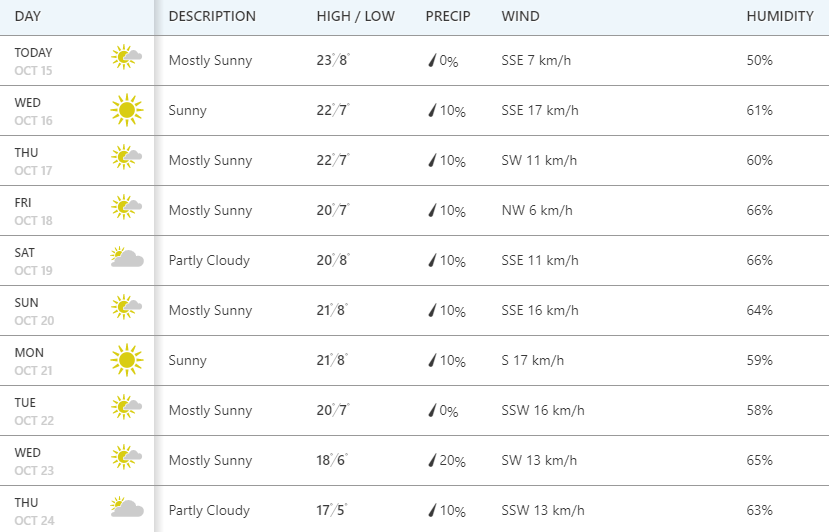 Сайт Weather.com сообщает, что в ближайшие дни погода будет преимущественно солнечной. Самым теплым днем будет 15 октября, когда температура поднимется до +23. В среду и четверг, 16 и 17 октября, будет до +22 днем и +7 ночью. Такая погода продержится до конца недели.