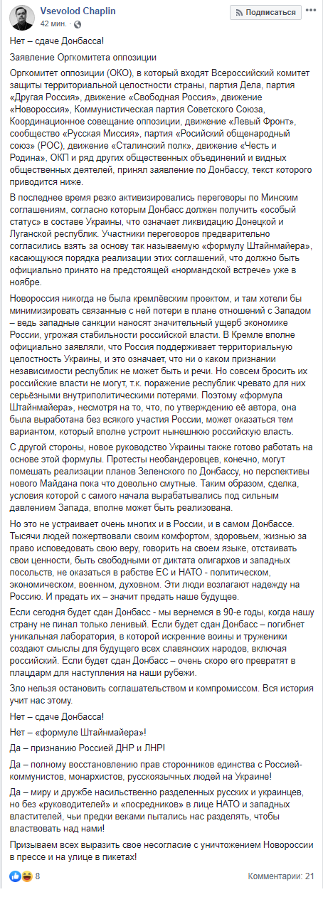 В России появился свой "Оргкомитет оппозиции", который выступает против формулы Штайнмайера, "сдачи Донбасса", но за признание Россией так называемых "ЛНР/ДНР". Об этом в Facebook написал известный священник РПЦ Всеволод Чаплин.
