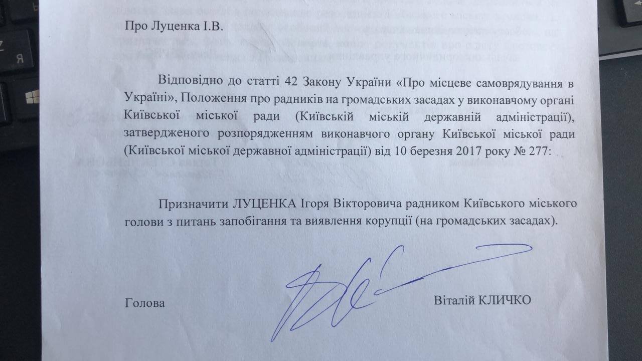 По его словам, он будет работать на общественных началах. Фото соответствующего распоряжения Кличко он опубликовал в соцсети.