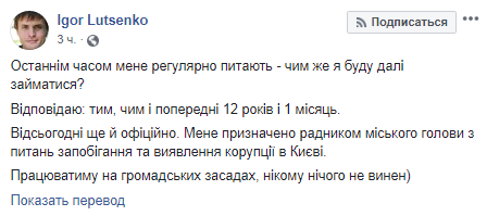 "В последнее время меня часто спрашивают - чем же я буду дальше заниматься? Отвечаю: тем, чем и предыдущие 12 лет и 1 месяц. С сегодняшнего дня еще и официально. Я назначен советником городского головы по вопросам предотвращения и выявления коррупции в Киеве", - написал Игорь Луценко.