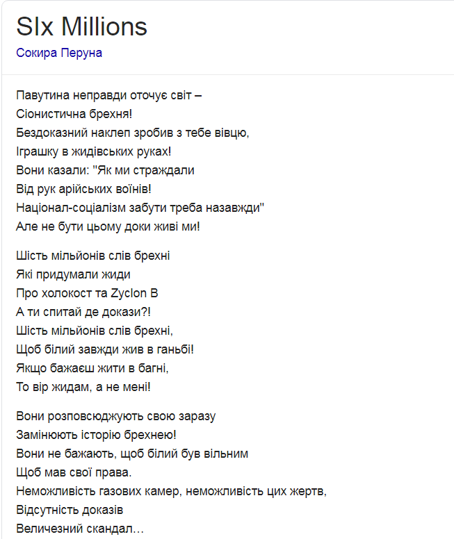 "Шесть миллионов слов вранья, которые придумали ж@ды, о Холокосте и "Циклоне В". А ты спроси, где доказательства. Шесть миллионов слов вранья, чтобы белый всегда жил в позоре! Если хочешь жить в грязи, то верь ж@дам, а не мне", - говорится во втором куплете песни.