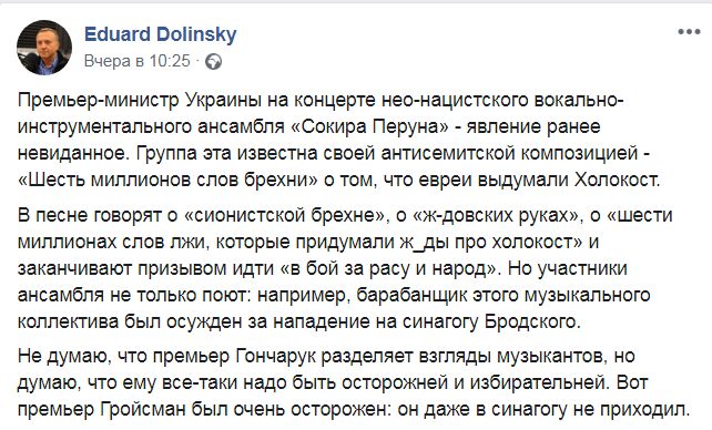 "В песне говорят о "сионистской брехне", о "ж@довских руках", о "шести миллионах слов лжи, которые придумали ж@ды про холокост" и заканчивают призывом идти "в бой за расу и народ". Но участники ансамбля не только поют: например, барабанщик этого музыкального коллектива был осужден за нападение на синагогу Бродского", - написал Долинский на своем Facebook.