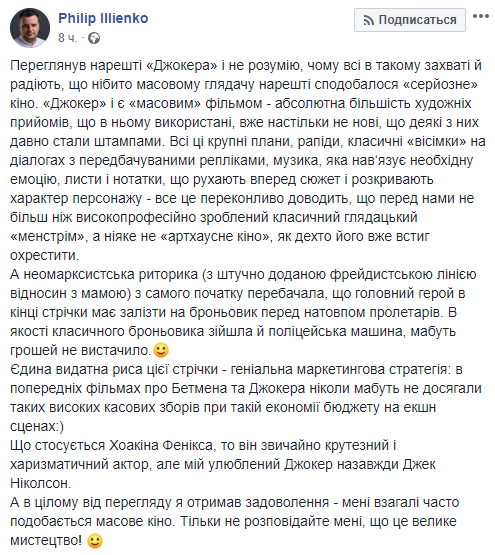 "Пересмотрел наконец "Джокера" и не понимаю, почему все в таком восторге и радуются, что якобы массовому зрителю наконец понравилось "серьезное" кино. "Джокер" и есть "массовый" фильм - абсолютное большинство художественных приемов, которые были в нем использованы, уже настолько не новы, что некоторые из них давно стали штампами. Все эти крупные планы, рапиды, классические "восьмерки" на диалогах с предполагаемыми репликами, музыка, которая навязывает необходимую эмоцию, письма и заметки, которые движут вперед сюжет и раскрывают характер персонажа - все это убедительно доказывает, что перед нами не более чем высокопрофессионально сделанный классический зрительский "мейнстрим", а никакое не "артхаусное кино", как некоторые его уже успели окрестить.