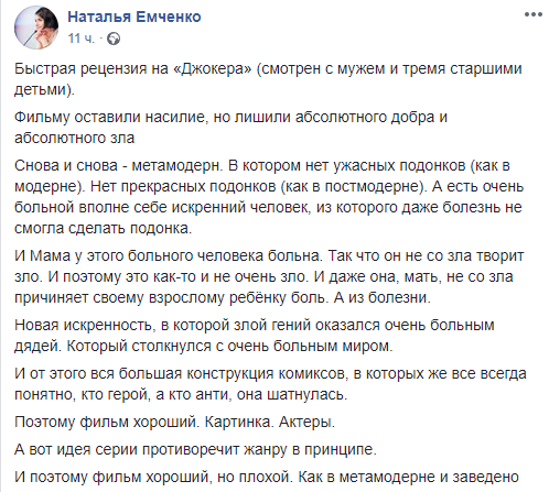 Директор по связям с общественностью и коммуникациям СКМ Наталья Емченко написала о "Джокере", что "фильм хороший, но плохой" и назвала его новой искренностью, в которой злой гений оказался очень больным дядей.
