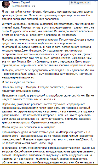 "Я мечтал пойти на этот фильм. Несколько месяцев назад меня зацепил трейлер "Джокера". Он обещал сумасшедше красивую историю. Он обещал раскрытие сложнейшего персонажа. Интрига усилилась, когда Венецианский кинофестиваль вручил фильму главный приз. Я начал потирать руки в предвкушении – давно такого не было. С удивлением читал, как Хоакина Феникса донимают вопросами о том, не видит ли он опасности в оправдании жестокости.