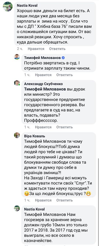 Далее ему указали, что "Хлебная база 76" - государственное предприятие, поэтому он предлагает людям фактически судиться с ним. Судя по дальнейшей переписке, министр экономики заблокировал пользователей, чьи комментарии ему не понравились