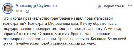 Сотрудники государственного предприятия "Хлебная база 76" обратились в Facebook к министру экономики Тимофею Милованову с жалобой на долги по зарплате, а он предложил им подать иск в суд. Об этом на своей странице в соцсети рассказал глава Жилищного союза Украины Александр Скубченко.