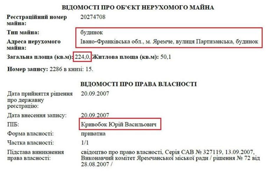 В декларации 2015 года Кривобок указал, что в собственности его жены находится 3 квартиры в селе Софиевская Борщаговка. Именно на месте этих квартир в 2009-2010 годы, когда он работал прокурором Оболонского района Киева, его родители и жена получили в собственность 16 гектаров земли.