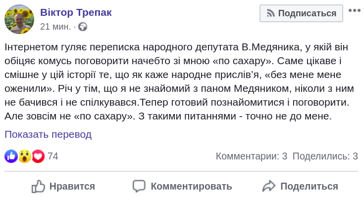 "По интернету гуляет переписка народного депутата В.Медяника, в которой он обещает кому-то поговорить вроде со мной "по сахару". Самое интересное и смешное в этой истории то, что, как говорит народная пословица, "без меня меня женили". Дело в том, что я не знаком с господином Медяником, никогда с ним не виделся и не общался. Тепер готов познакомиться и поговорить. Но вовсе не "по сахару". С такими вопросами - точно не ко мне" - написал чиновник.