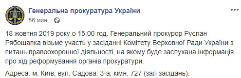 "Генеральный прокурор Руслан Рябошапка примет участие в заседании Комитета Верховной Рады Украины по вопросам правоохранительной деятельности, на котором будет заслушана информация о ходе реформирования органов прокуратуры", - говорится в сообщении.