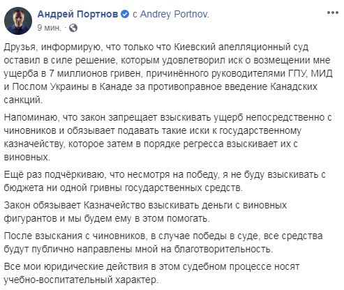Киевский апелляционный суд оставил в силе решение, которым удовлетворен иск о возмещении юристу Андрею Портнову ущерба в 7 млн грн, причиненного руководителями ГПУ, МИД и послом Украины в Канаде противоправным введением канадских санкций. Об этом сам юрист Андрей Портнов сообщил в Facebook.