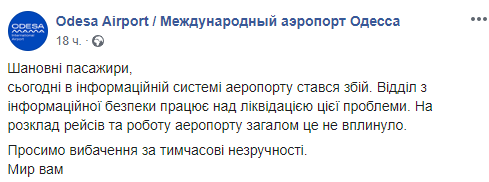 "Сегодня в информационной системе аэропорта произошел сбой. Отдел по информационной безопасности работает над ликвидацией этой проблемы. На расписание рейсов и работу аэропорта в целом это не повлияло. Просим прощения за временные неудобства. Мир вам", – говорится на странице аэропорта "Одесса" в соцсети.