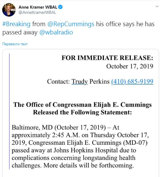 "Около 2.45 в четверг, 17 октября 2019 года, конгрессмен Элия Каммингс умер в больнице имени Джона Хопкинса в связи с длительным ухудшением состояния здоровья", - говорится в заявлении.