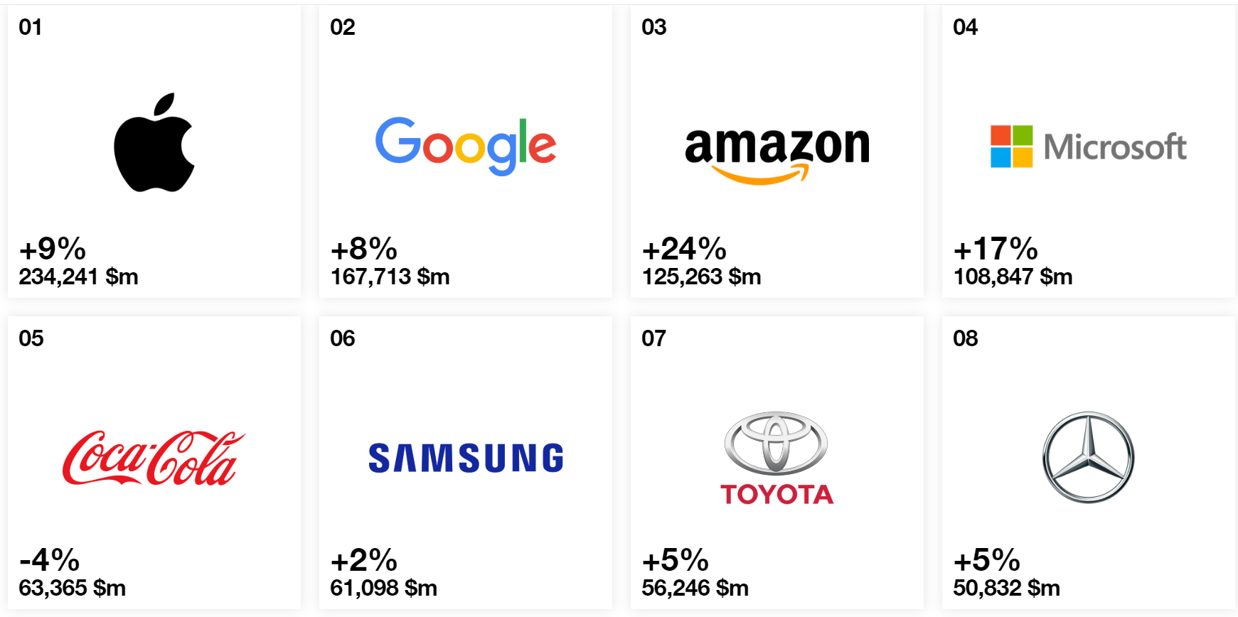 По подсчетам аналитиков, компания Apple в 2019 году подорожала до 234,241 миллиарда долларов США (на 9%), а Google - до 167,713 миллиарда долларов (на 8%). Третья строка в рейтинге досталась компании-сайту интернет-покупок Amazon (125,263 миллиарда долларов).