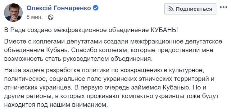 В Верховной Раде создали межфракционное объединение "КУБАНЬ!" Об этом говорится на фб-странице нардепа от "Европейской солидарности" Алексея Гончаренко в четверг, 17 октября. Он назначен руководителем данного объединения.