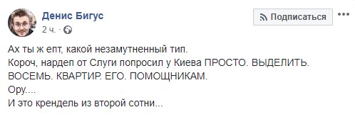 "Ах ты ж епт, какой незамутненный тип. Короч, нардеп от Слуги попросил у Киева ПРОСТО. ВЫДЕЛИТЬ. ВОСЕМЬ. КВАРТИР. ЕГО. ПОМОЩНИКАМ. Ору.... И это крендель из второй сотни..."? - написал Бигус.