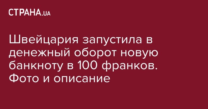 Швейцария запустила в свой денежный оборот новую банкноту 100 франков (девятой серии), сообщил Нацбанк Украины нашим финучреждениям в телеграмме №50-0006/52440. Она уже развезена по местным банкам и принимается в торгово-сервисной сети страны. Новая серия швейцарских франков имеет общий элемент - изображение рук и земного шара. Ее тема "Многогранность Швейцарии".