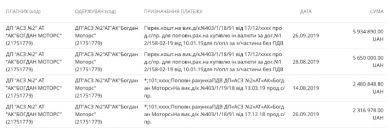 Деньги перечислены со счета Государственного казначейства на частный счет "Богдан Моторс", открытый в "ОТП банке". За что именно уплачены деньги - количество авто и стоимость за единицу - не указано.