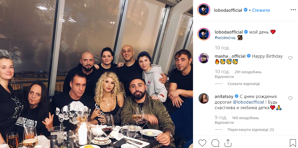 Украинская певица Светлана Лобода опубликовала в соцсети фото со своего дня рождения, на котором она находится в окружении друзей, а рядом с ней сидит вокалист немецкой группы Rammstein Тилль Линдеманн. Именинница держит его под руку. Снимок появился в Instagram артистки в ночь на пятницу, 18 октября.