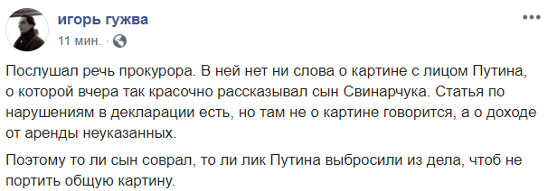 23:09 "Послушал речь прокурора. В ней нет ни слова о картине с лицом Путина, о которой вчера так красочно рассказывал сын Свинарчука. Статья по нарушениям в декларации есть, но там не о картине говорится, а о доходах от аренды неуказанных.