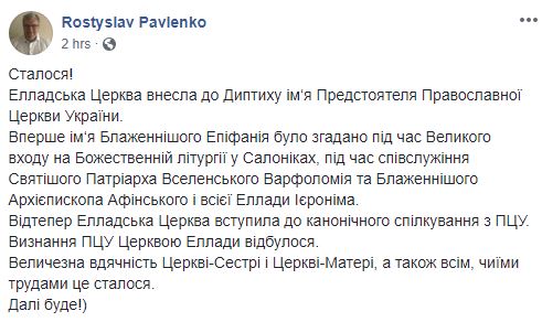 "Элладская церковь внесла в диптих имя предстоятеля Православной церкви Украины. Впервые имя Блаженнейшего Епифания было упомянуто во время великого входа на Божественной литургии в Салониках, во время сослужения Святейшего Патриарха Вселенского Варфоломея и Блаженнейшего архиепископа Афинского и всей Эллады Иеронима. Теперь Элладская церковь вступила в каноническое общение с ПЦУ. Признание ПЦУ Церковью Эллады произошло", - написал он.