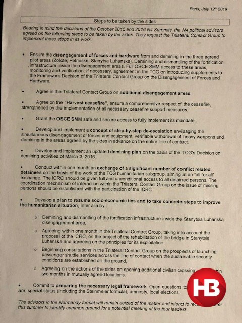 В нем говорится, что стороны обязуются подготовить правовые рамки относительно "особого статуса Донбасса", включая формулу Штайнмайера.